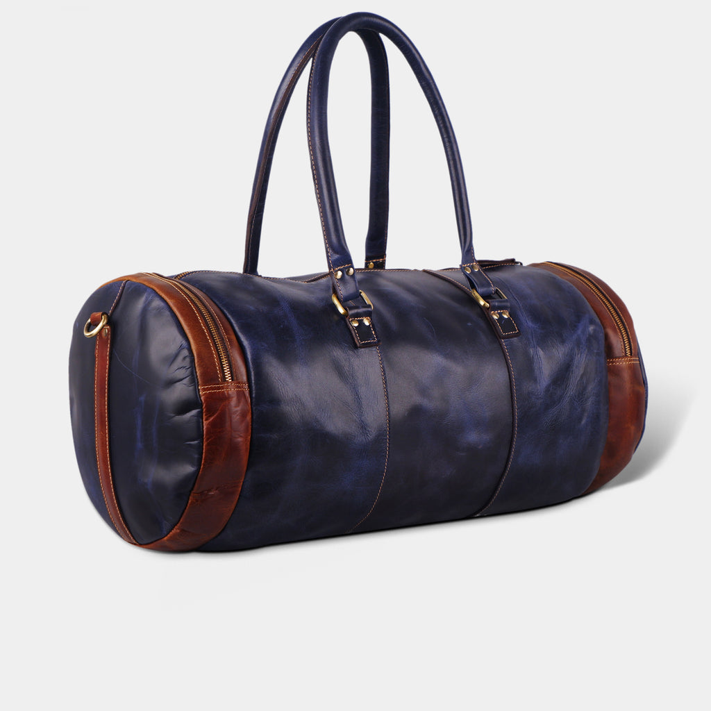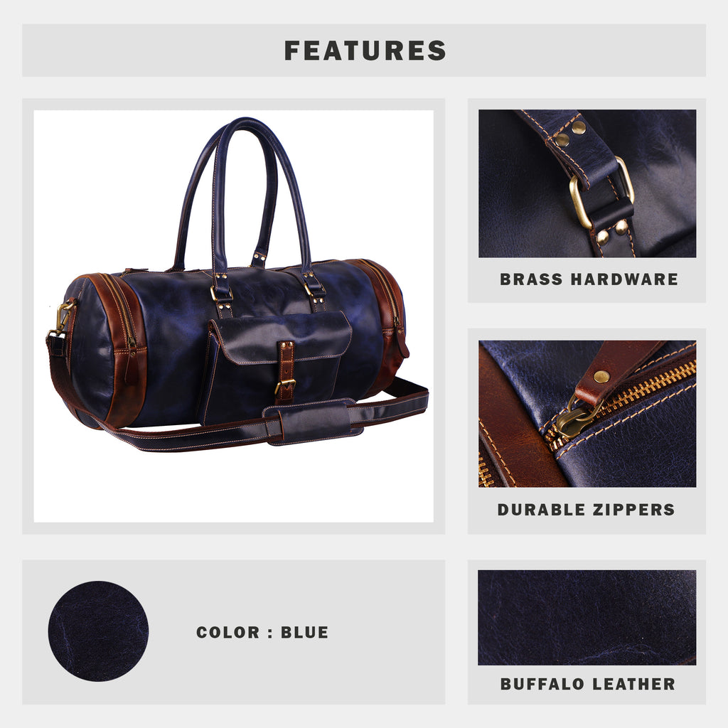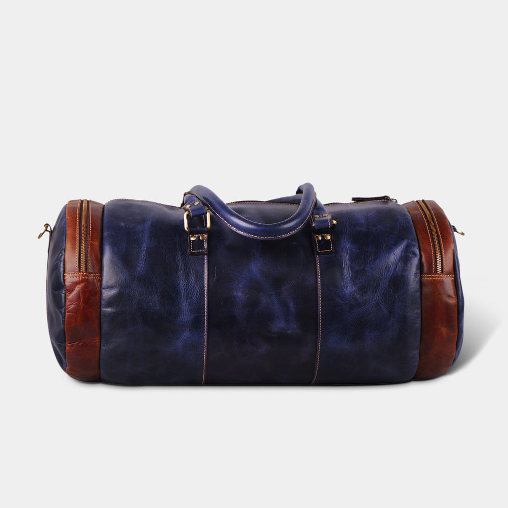 Full Grain Buffalo Leather Blue Round Duffel Bag