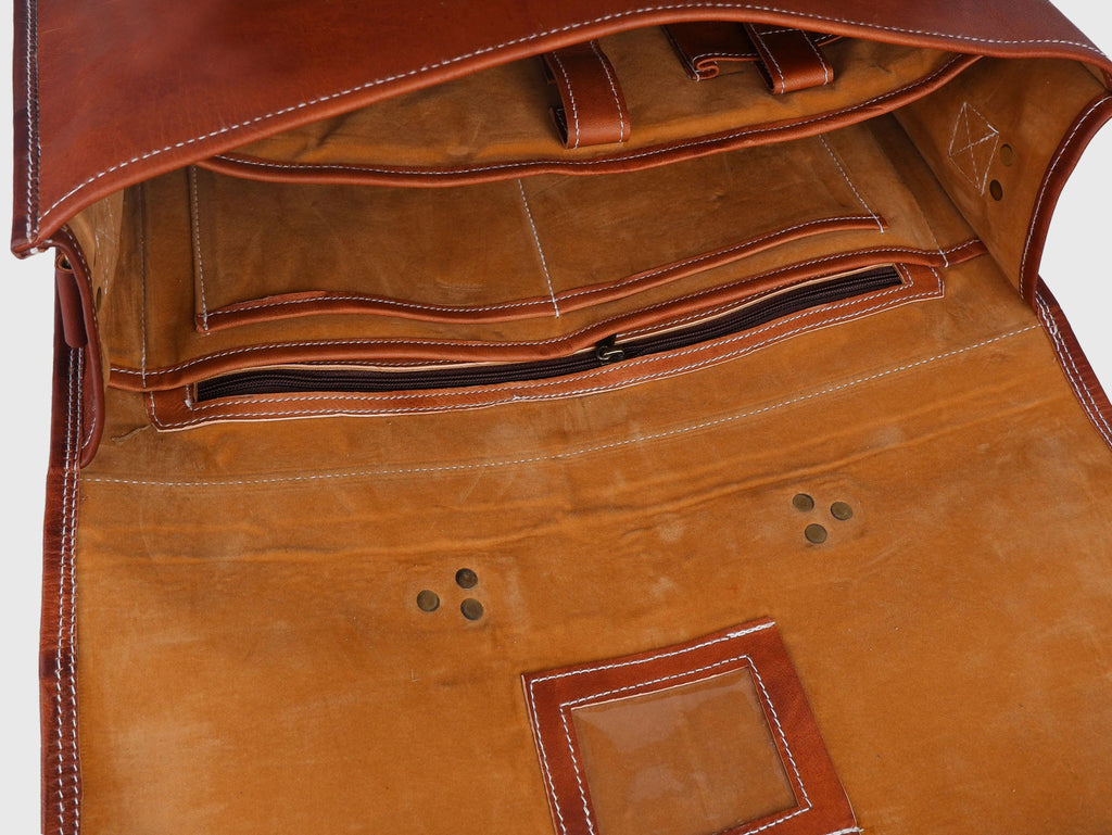 We are glad to let you know that all the procedures followed in tanning the skin is natural. Thus, it’s environment friendly and devoid of harmful chemicals. The vintage-looking, semi-glossy surface of the messenger bag is water and scratch-resistant. It is underlined by a high-quality canvas, thus giving it a neat internal finish.