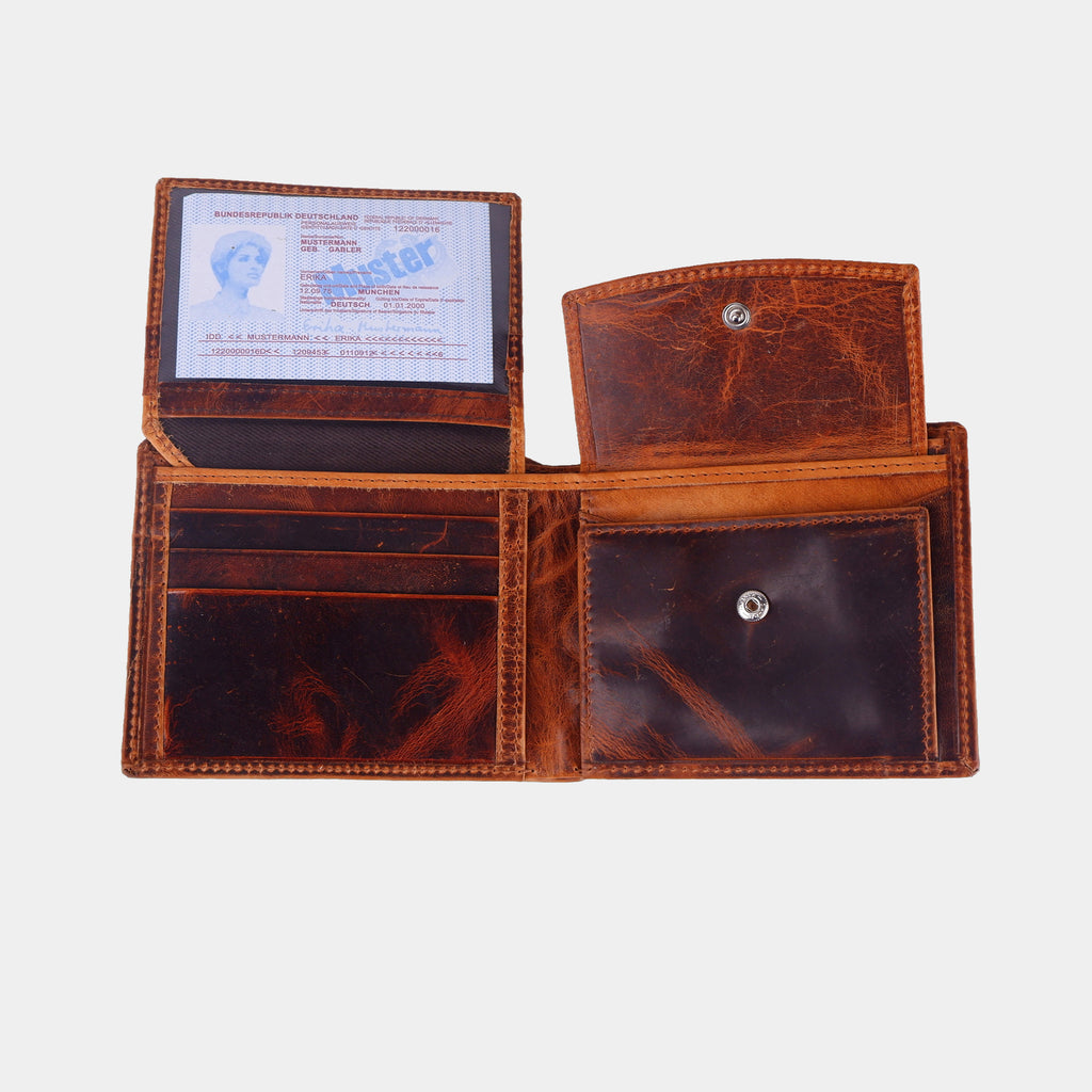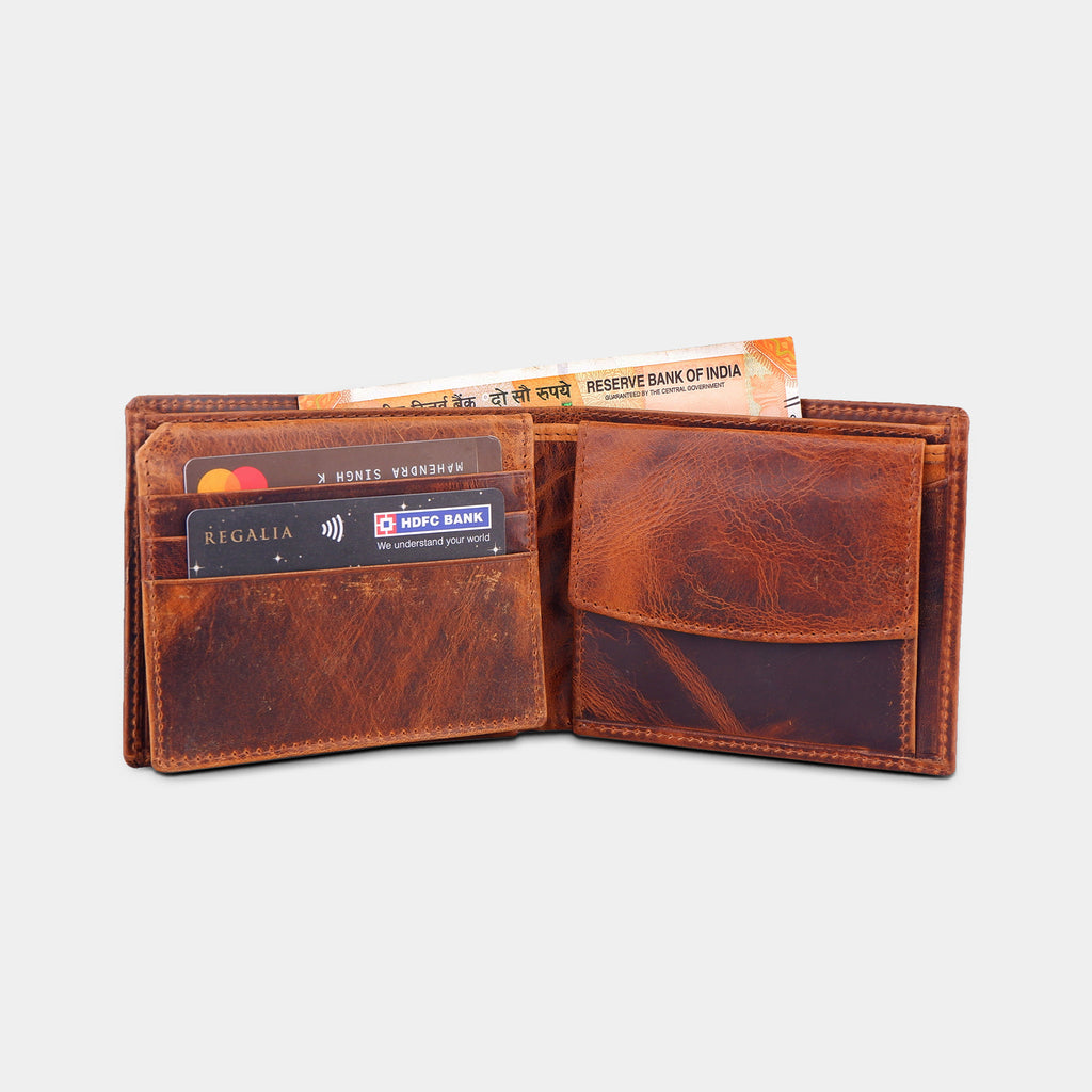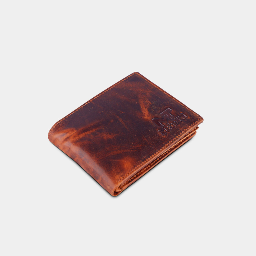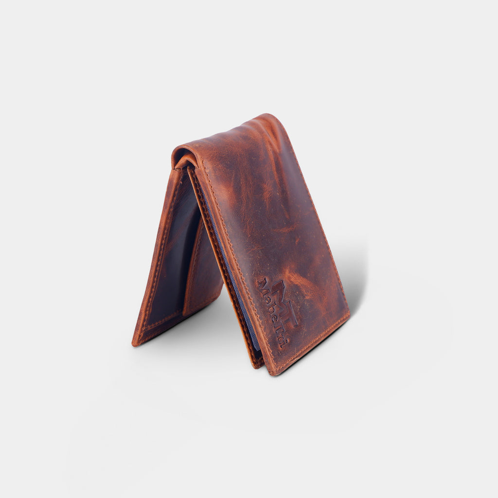 A slim, vertical bi-fold wallet that can hold multiple cards and bills in the internal card slots. Features an multiple sections for easy access to your IDs and cards.