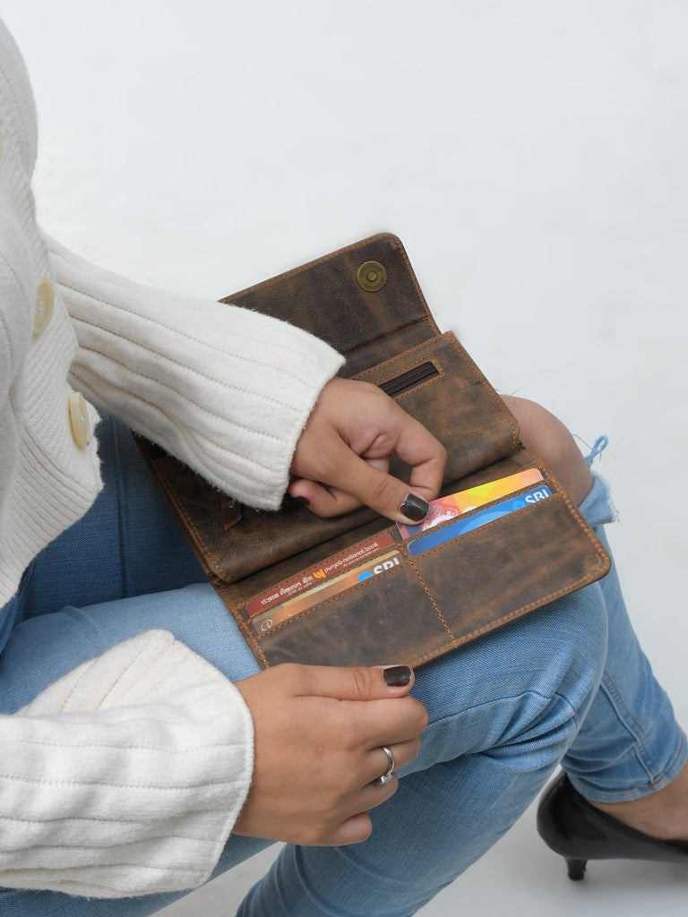 This wallet comes with multiple card slots, cash compartments and a coin compare to keep your loose change. Its tip-top button enclosure on the flap cover makes it very fascinating.